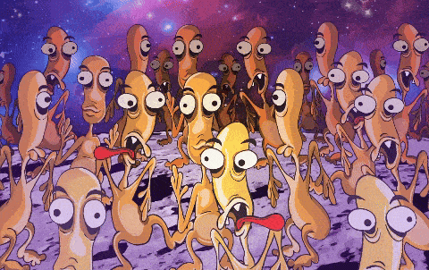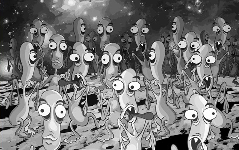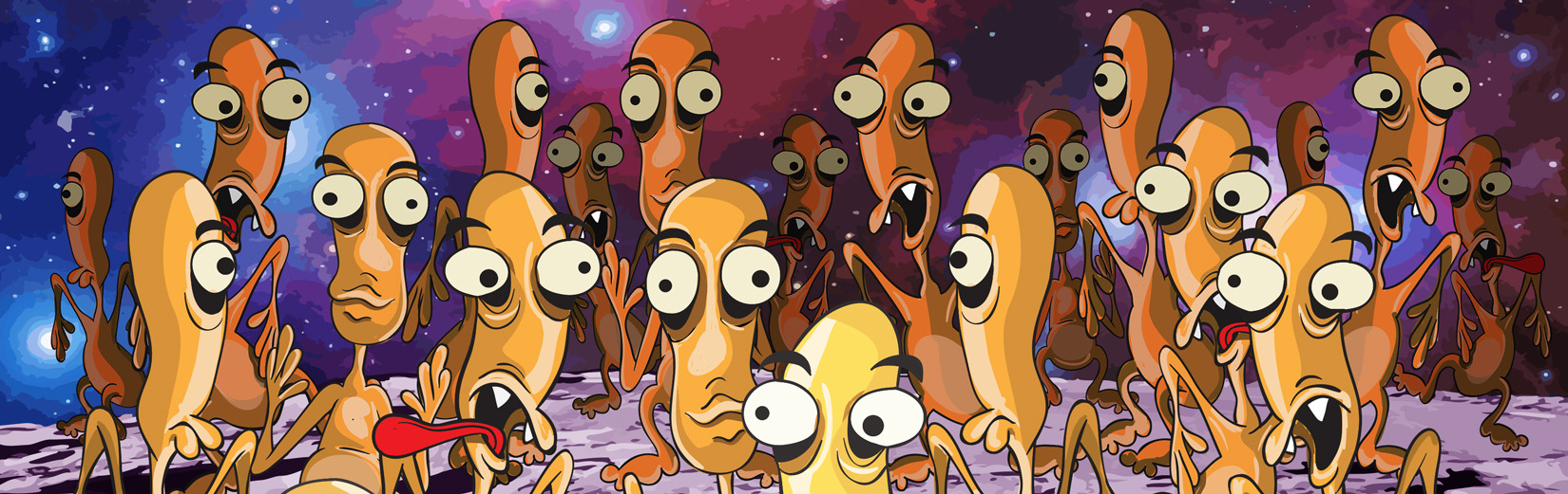 This surreal, cartoon-style illustration was crafted using precise vector art techniques, allowing for crisp lines, vibrant colours, and smooth, scalable details. The chaotic space scene bursts with energy as a group of small, orange, humanoid creatures interact in wide-eyed amazement, their exaggerated features enhanced by the clean, polished look of vector rendering.