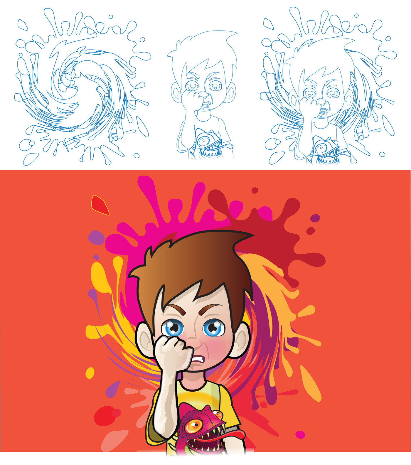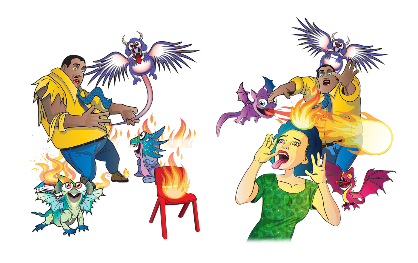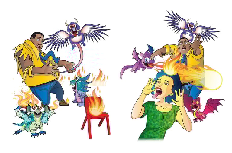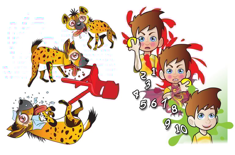 The story follows Jeremy, a boy whose anger manifests into chaotic fire-breathing dragons and mischievous hyenas, wreaking havoc in the classroom. Through expressive and dynamic illustrations, I brought Jeremy’s journey to life, visually capturing the transformation from frustration to self-control.